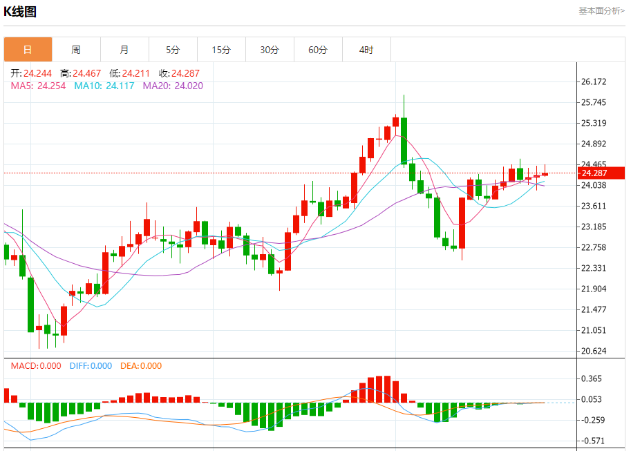 周四盘中,现货白银报24.287,涨幅0.17%。 今日分析:在24.20之上,看涨,目标价位为24.47,然后为24.60。 技术点评:24.20附近形成了一个支撑的底部,将带来走势短期内的稳定。 支撑位:24.2024.1023.95 阻力位:24.7524.6024.47 (亚汇网编辑: