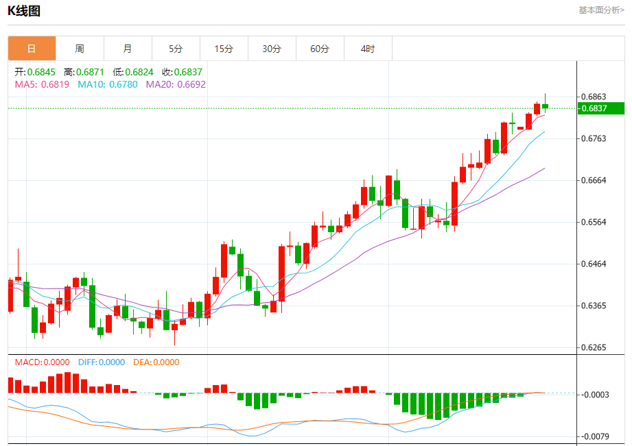 今日周四,澳元兑美元报0.6838,跌幅0.13%;美元兑加元报1.3227,涨幅0.15%;美元兑瑞郎报0.8367,跌幅0.70%。 澳元兑美元汇率分析 技术点评:RI技术指标向下运行。 阻力位:0.68800.68700.6855 支撑位:0.68100.67950.6780 美元兑加元汇率分析