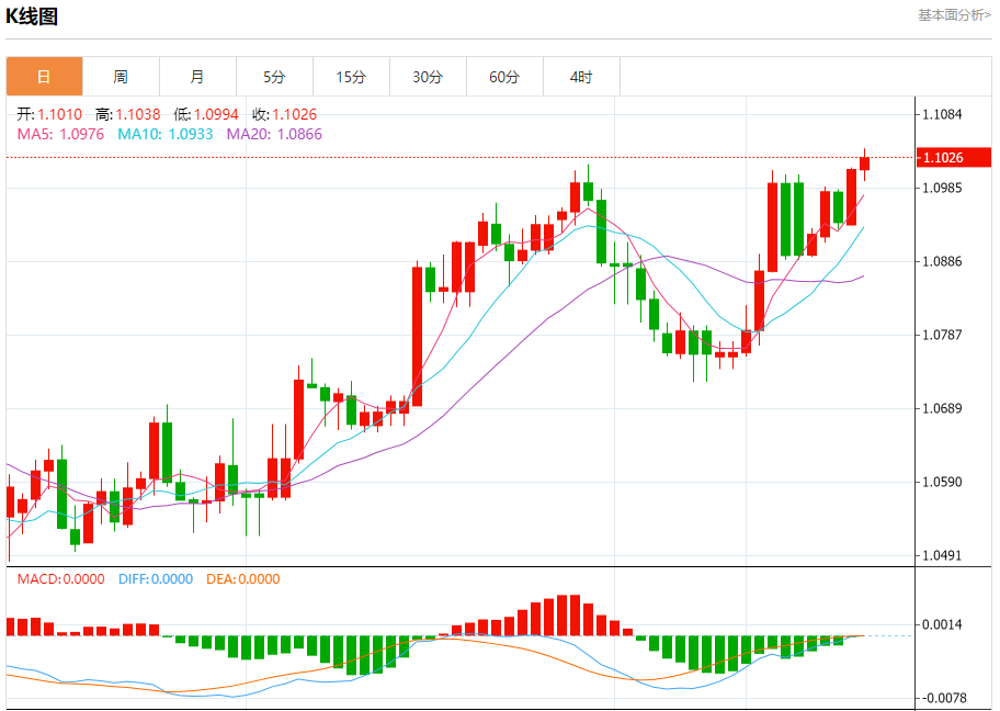 周五盘中,欧元/美元报1.1027,涨幅0.14%。 今日分析:在1.0990之上,看涨,目标价位为1.1045,然后为1.1065。 技术点评:RI技术指标向上运行。 支撑位:1.09901.09701.0950 阻力位:1.10851.10651.1045 (亚汇网编辑:冰凡)