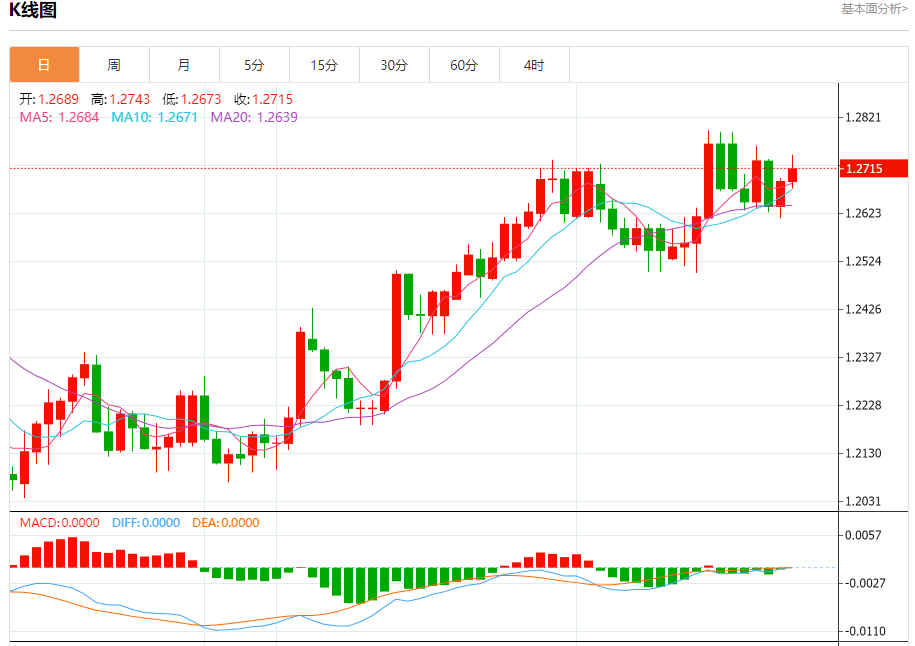 周五盘中,英镑/美元报1.2716,涨幅0.20%。 今日分析:在1.2675之上,看涨,目标价位为1.2760,然后为1.2790。 技术点评:RI技术指标向上运行。 支撑位:1.26751.26451.2610 阻力位:1.28151.27901.2760 (亚汇网编辑:冰凡)