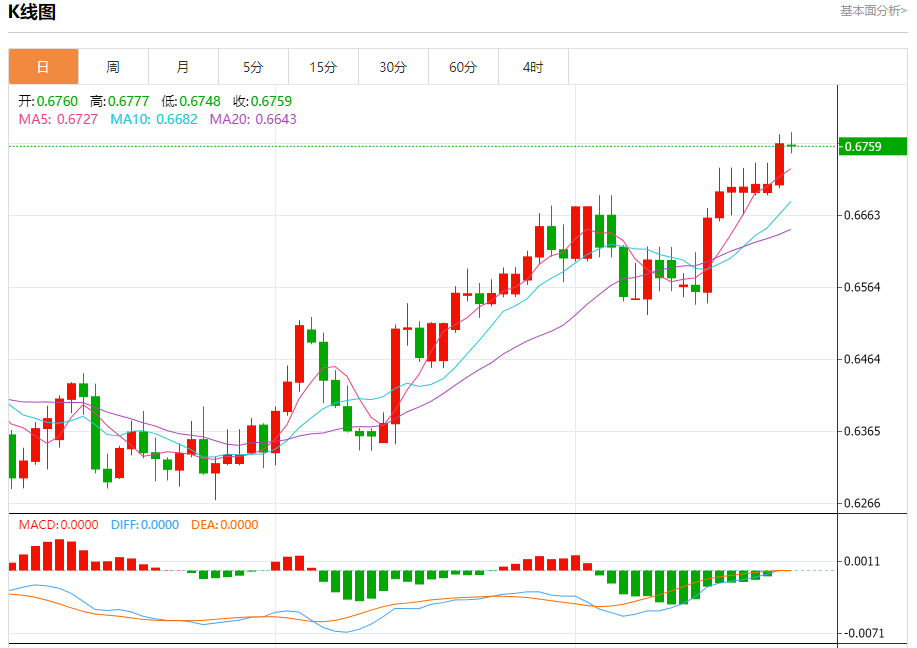 今日周三,澳元兑美元报0.6761,跌幅0.03%;美元兑加元报1.3348,涨幅0.11%;美元兑瑞郎报0.8649,涨幅0.46%。 澳元兑美元汇率分析 技术点评:随后的阻力位是0.6775,然后为0.6800。 阻力位:0.68250.68000.6775 支撑位:0.67400.67100.6690 美元