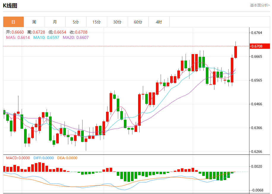 今日周四,澳元兑美元报0.6708,涨幅0.72%;美元兑加元报1.3438,跌幅0.60%;美元兑瑞郎报0.8684,跌幅0.38%。 澳元兑美元汇率分析 技术点评:RI技术指标缺乏下降动能 阻力位:0.68300.68000.6770 支撑位:0.66500.66100.6580 美元兑加元汇率分析