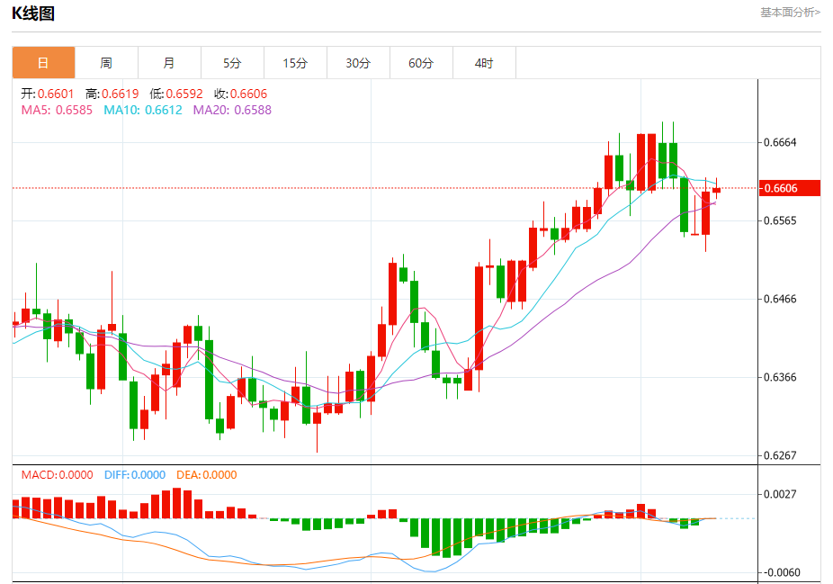 今日周五,澳元兑美元报0.6607,涨幅0.07%;美元兑加元报1.3577,跌幅0.17%;美元兑瑞郎报0.8749,涨幅0.02%。 澳元兑美元汇率分析 技术点评:0.6590附近形成了一个支撑的底部,将带来走势短期内的稳定。 阻力位:0.66650.66450.6625 支撑位:0.65900.65550.652
