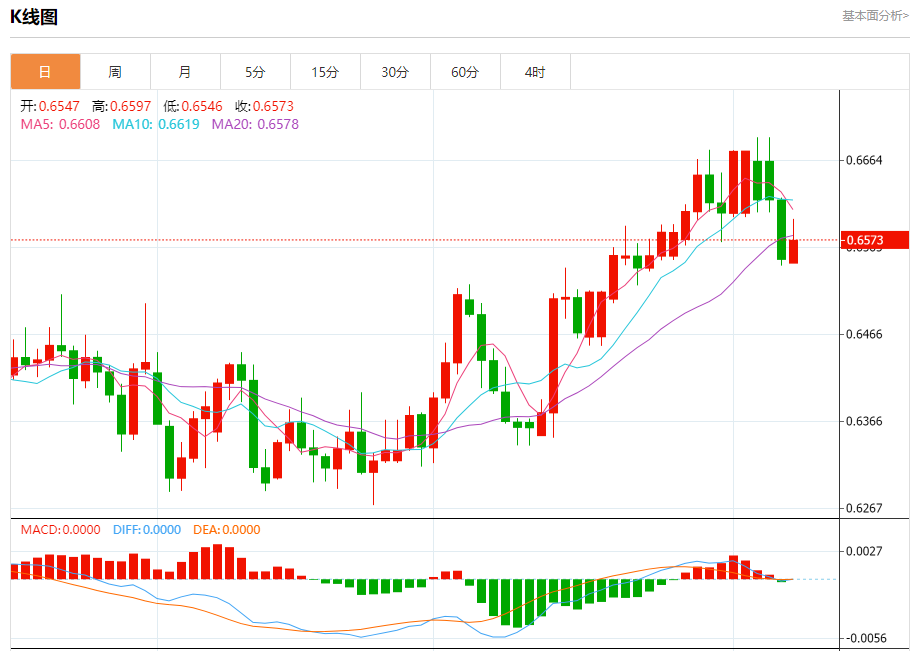 今日周三,澳元兑美元报0.6574,涨幅0.33%;美元兑加元报1.3567,跌幅0.19%;美元兑瑞郎报0.8754,涨幅0.03%。 澳元兑美元汇率分析 技术点评:0.6565附近形成了一个支撑的底部,将带来走势短期内的稳定。 阻力位:0.66350.66200.6595 支撑位:0.65650.65450.653