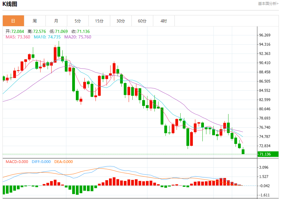 周三盘中,WTI原油报71.140,跌幅1.26%。 今日分析:在72.60之下,看跌,目标价位为71.00,然后为70.30。 技术点评:跌破72.60,为空头信号,向下的目标将会是71.00。 支撑位:71.0070.3070.00 阻力位:74.1073.3072.60 (亚汇网编辑:冰凡)