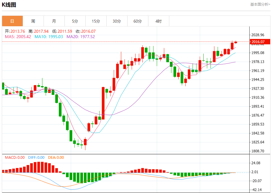 周二盘中,现货黄金报2017.06,涨幅0.15%。 今日分析:在2008.00之上,看涨,目标价位为2018.00,然后为2025.00。 技术点评:RI技术指标运行趋势复杂,倾向于上涨。 支撑位:2008.002003.001997.00 阻力位:2032.002025.002018.00 (亚汇网编辑: