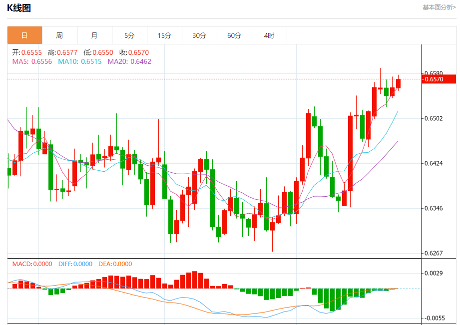 今日周五,澳元兑美元报0.6571,涨幅0.22%;美元兑加元报1.3680,跌幅0.11%;美元兑瑞郎报0.8831,跌幅0.10%。 澳元兑美元汇率分析 技术点评:RI技术指标向上运行。 阻力位:0.66200.66000.6585 支撑位:0.65450.65300.6520 美元兑加元汇率分析