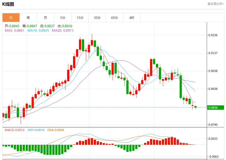 周二纽盘,瑞郎兑美元交投于0.8838,跌幅为0.13%。 瑞郎基本面分析 瑞银全球财富管理表示,美元的快速贬值可能已经过头了。尽管上周美国经济活动和通胀数据走软,表明美联储利率已见顶,但我们认为市场的反应可能过头了。 预计到2024年初,美元兑主要货币将持稳并保持区间波