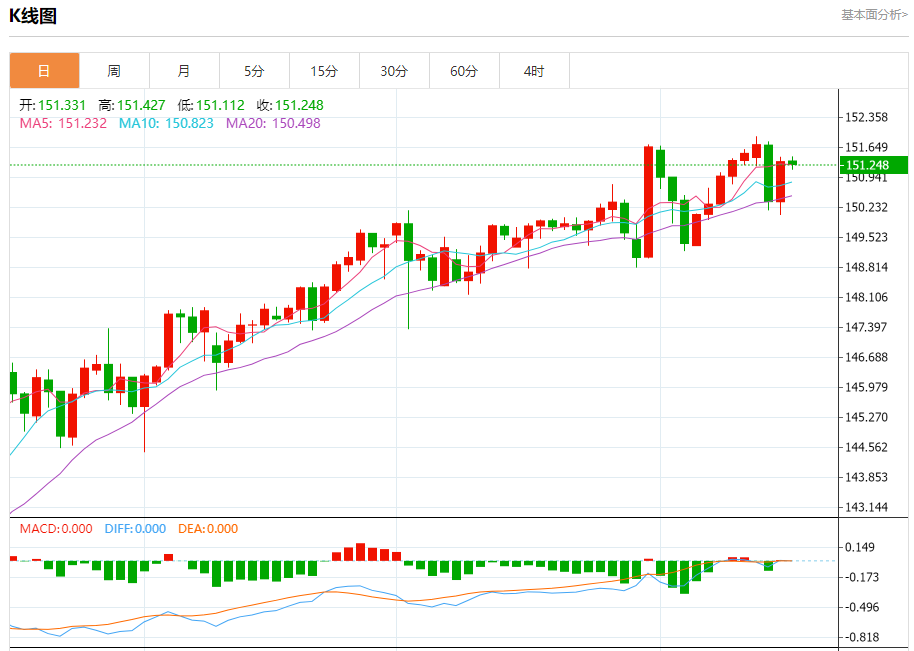 周四盘中,美元/日元报151.211,跌幅0.08%。 今日分析:在150.80之上,看涨,目标价位为151.65,然后为151.95。 技术点评:RI技术指标向上运行。 支撑位:150.80150.45150.20 阻力位:152.25151.95151.65 (亚汇网编辑:冰凡)