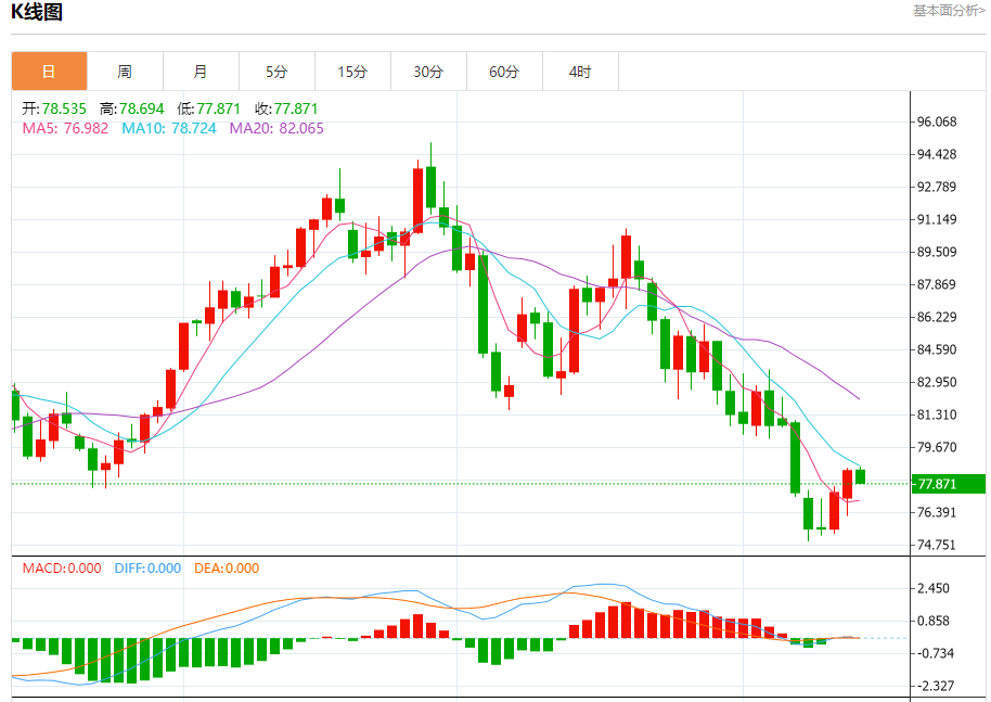 周二盘中,WTI原油报78.450,跌幅0.07%。 今日分析:在77.50之上,看涨,目标价位为79.00,然后为79.70。 技术点评:RI技术指标缺乏下降动能 支撑位:77.5076.9076.25 阻力位:80.7079.7079.00 (亚汇网编辑:冰凡)