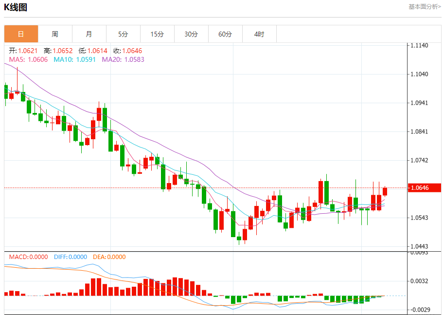 周五盘中,欧元/美元报1.0646,涨幅0.23%。 今日分析:在1.0620之上,看涨,目标价位为1.0665,然后为1.0685。 技术点评:RI技术指标向上运行。 支撑位:1.06201.06001.0575 阻力位:1.06951.06851.0665 (亚汇网编辑:冰凡)