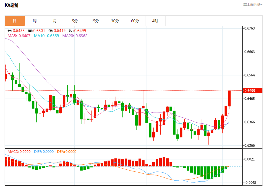 今日周五,澳元兑美元报0.6502,涨幅1.05%;美元兑加元报1.3696,跌幅0.31%;美元兑瑞郎报0.8992,跌幅0.75%。 澳元兑美元汇率分析 技术点评:RI技术指标缺乏上升动能? 阻力位:0.64950.64750.6455? 支撑位:0.64100.63900.6370 美元兑加元汇率