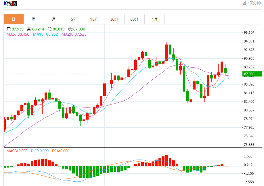 周一盘中,WTI原油报87.841,跌幅0.36%。 今日分析:在86.90之上,看涨,目标价位为88.80,然后为89.85。 技术点评:RI技术指标看涨,有进一步上升空间。 支撑位:86.9086.1085.40 阻力位:90.3089.8588.80 (亚汇网编辑:冰凡)