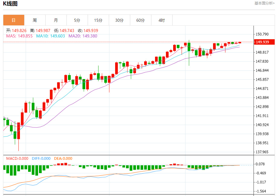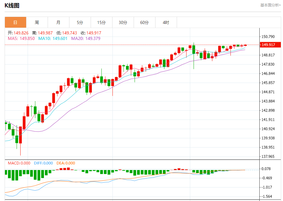 周一盘中,美元/日元报149.959,涨幅0.07%。 今日分析:在149.75之上,看涨,目标价位为150.00,然后为150.15。 技术点评:RI技术指标向上运行。 支撑位:149.75149.65149.50 阻力位:150.30150.15150.00 (亚汇网编辑:冰凡)