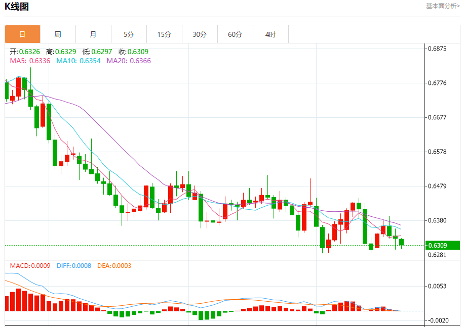 今日周五,澳元兑美元报0.6310,跌幅0.30%;美元兑加元报1.3687,跌幅0.23%;美元兑瑞郎报0.8927,涨幅0.17%。 澳元兑美元汇率分析 技术点评:RI技术指标运行趋势复杂,倾向于下跌。 阻力位:0.63700.63550.6340? 支撑位:0.62950.62800.6265 美