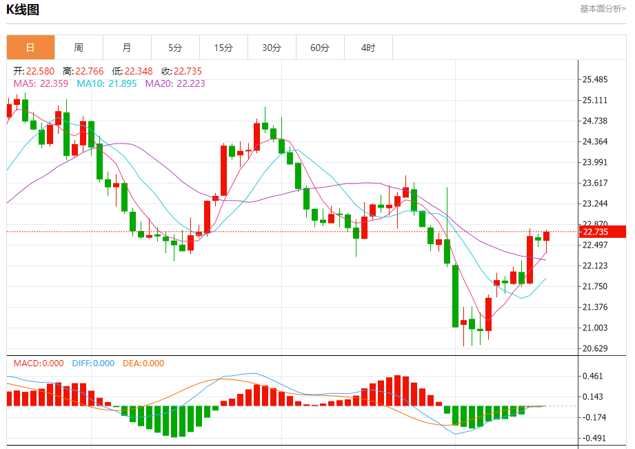 周二盘中,现货白银报22.577,跌幅0.04%。 今日分析:在22.35之上,看涨,目标价位为22.81,然后为23.00。 技术点评:RI技术指标向上运行。 支撑位:22.3522.2022.05 阻力位:23.2523.0022.81 (亚汇网编辑:冰凡)