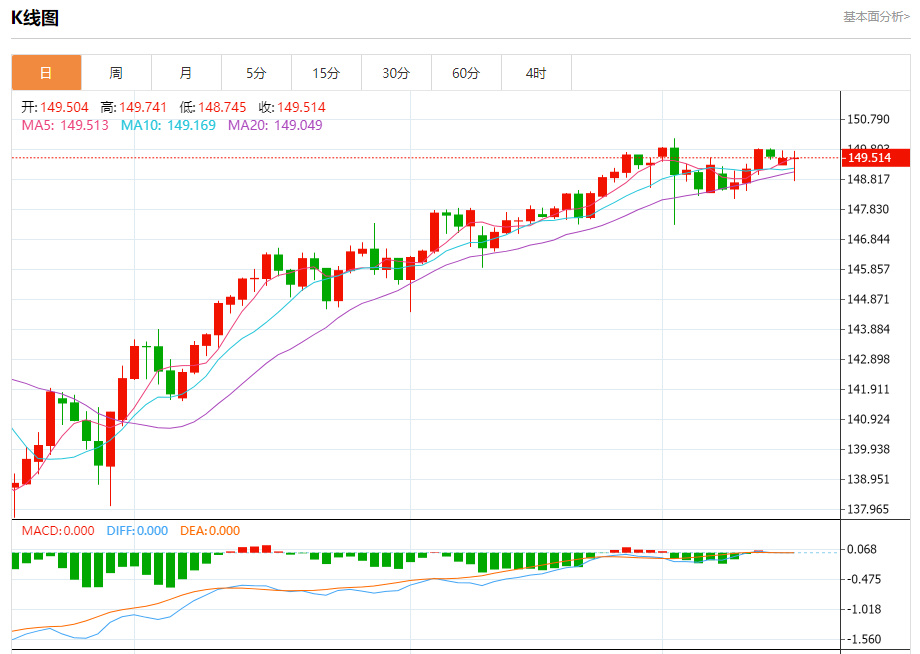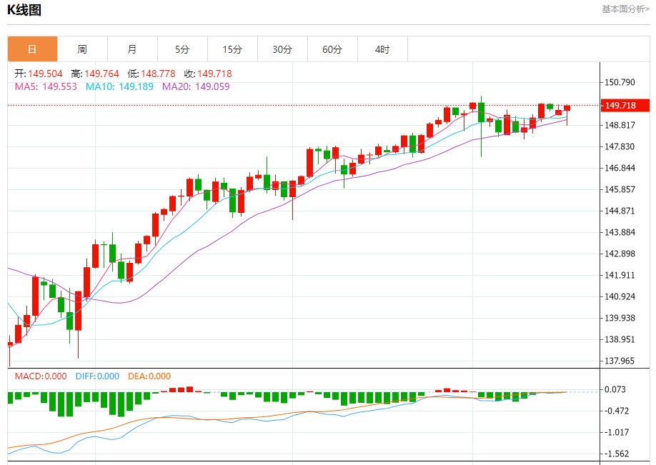 周二盘中,美元/日元报149.713,涨幅0.13%。 今日分析:在149.75之下,看跌,目标价位为149.20,然后为149.05。 技术点评:RI技术指标向下运行。 支撑位:149.20149.05148.95 阻力位:150.10149.90149.75 (亚汇网编辑:冰凡)