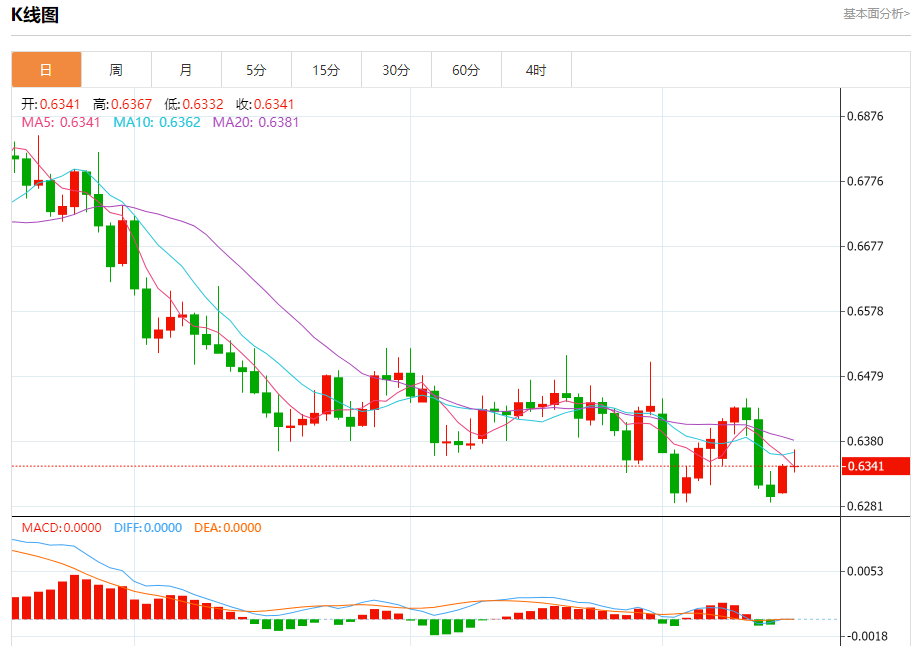 今日周二,澳元兑美元报0.6343,涨幅0.00%;美元兑加元报1.3687,涨幅0.55%;美元兑瑞郎报0.9024,涨幅0.22%。 澳元兑美元汇率分析 技术点评:RI技术指标向上运行。 阻力位:0.64050.63850.6365 支撑位:0.63300.63150.6300 美元兑加元汇率分析