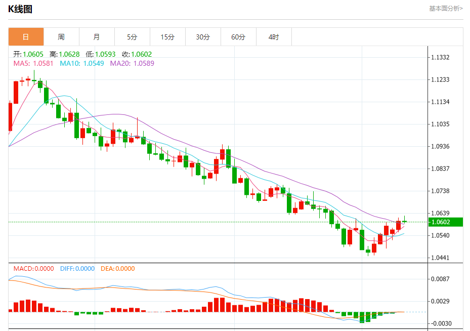 周三晚间,美元指数现报105.837,涨幅0.06%,现对美元兑欧元、英镑、日元主要货币对分析表述如下: 欧元/美元 汇价高见1.0628,低见1.0593。上一交易日,汇价收于1.0605。 基本面:随着全球工业需求低迷出现企稳迹象,欧元区工厂的低迷可能已接近谷底,有理由相信欧元区本季