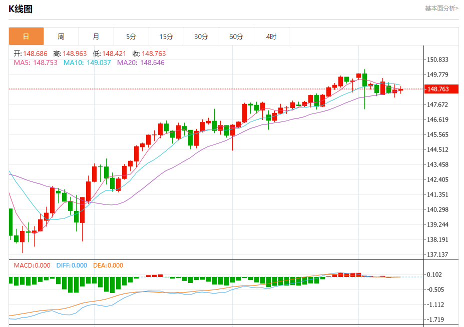 周三盘中,美元/日元报148.888,涨幅0.11%。 今日分析:在148.50之上,看涨,目标价位为148.95,然后为149.10。 技术点评:RI技术指标运行趋势复杂,倾向于上涨。 支撑位:148.50148.35148.15 阻力位:149.30149.10148.95 (亚汇网编辑:冰凡)
