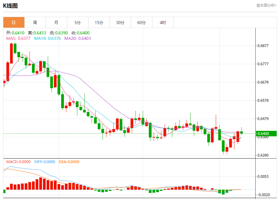 今日周二,澳元兑美元报0.6400,跌幅0.17%;美元兑加元报1.3600,涨幅0.07%;美元兑瑞郎报0.9071,涨幅0.06%。 澳元兑美元汇率分析 技术点评:RI技术指标运行趋势复杂,倾向于下跌。 阻力位:0.64750.64550.6435 支撑位:0.63850.63550.6340 美元