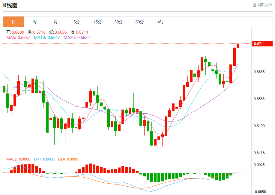 今日周三,澳元兑美元报0.6713,涨幅0.17%;美元兑加元报1.3675,跌幅0.09%;美元兑瑞郎报0.7868,跌幅0.08%。 澳元兑美元汇率分析 技术点评:RI技术指标看涨,有进一步上升空间。 阻力位:0.67600.67450.6730 支撑位:0.66850.66700.6655 美元兑
