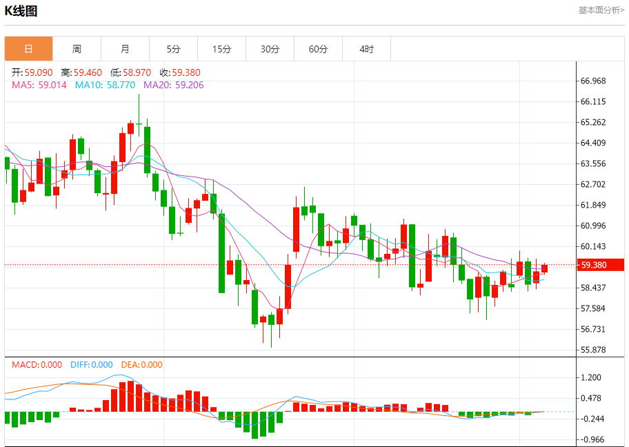 周四盘中,WTI原油报59.350,涨幅0.70%。 今日分析:在58.85之上,看涨,目标价位为59.65,然后为59.95。 技术点评:超短线(当日内)技术指标运行趋势复杂。 支撑位:58.8558.3058.00 阻力位:60.4059.9559.65 (亚汇网编辑:冰凡)
