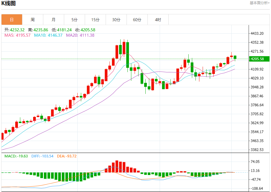 周二盘中,现货黄金报4205.58,跌幅0.63%。 今日分析:在4215之上,看涨,目标价位为4251,然后为4265。 技术点评:RI技术指标运行趋势复杂。 支撑位:421542044190 阻力位:429042654251 (亚汇网编辑:冰凡)