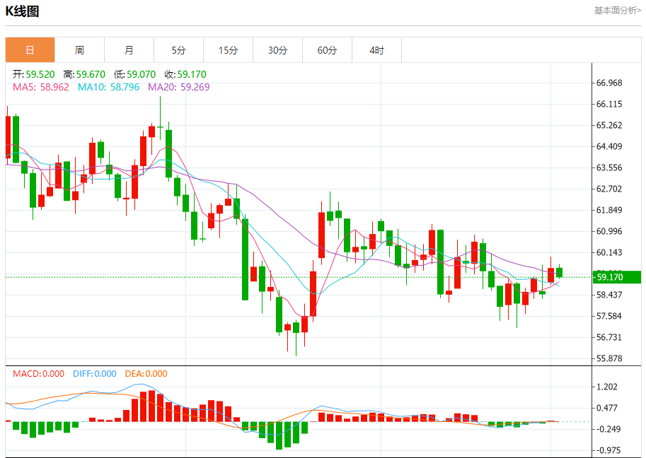 周二盘中,WTI原油报59.170,跌幅0.25%。 今日分析:在59.10之上,看涨,目标价位为59.85,然后为60.10。 技术点评:RI技术指标呈现继续上升趋势。 支撑位:59.1058.7058.25 阻力位:60.5060.1059.85 (亚汇网编辑:冰凡)