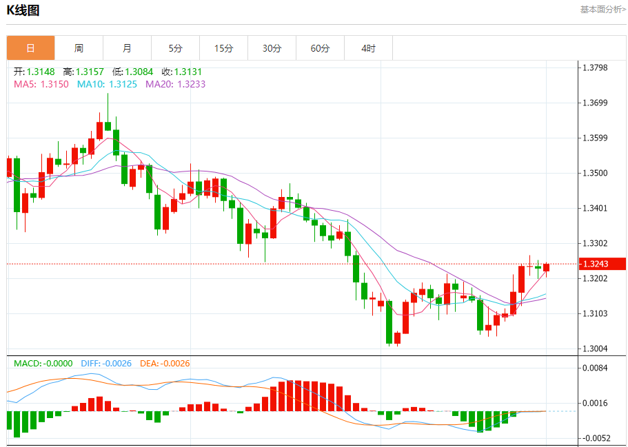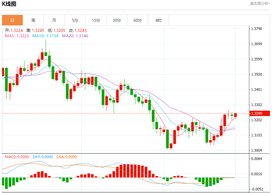 周一盘中,英镑/美元报1.3248,涨幅0.08%。 今日分析:在1.3195之上,看涨,目标价位为1.3245,然后为1.3265。 技术点评:RI技术指标运行趋势复杂,倾向于上升。 支撑位:1.31951.31751.3150 阻力位:1.32851.32651.3245 (亚汇网编辑:冰凡)