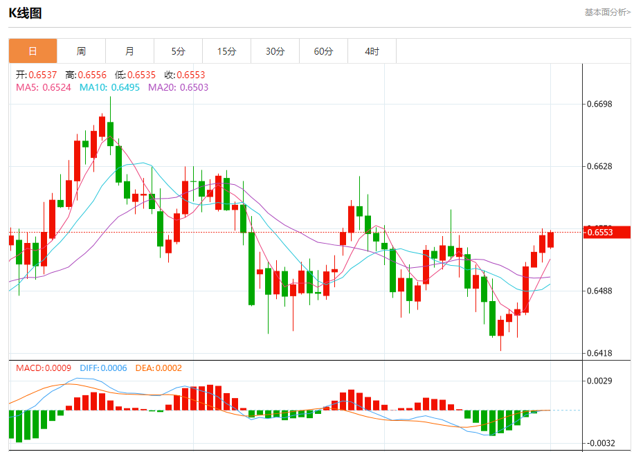 今日周一,澳元兑美元报0.6556,涨幅0.05%;美元兑加元报1.3964,跌幅0.10%;美元兑瑞郎报0.8014,跌幅0.31%。 澳元兑美元汇率分析 技术点评:随后的阻力位是0.6560,然后为0.6580。 阻力位:0.66000.65800.6560 支撑位:0.65250.65050.6485 美元