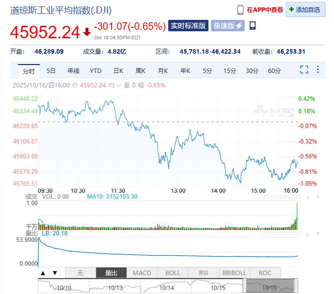 2025年10月17日星期五,以下是由亚汇网整理的昨夜今晨国际财经要闻汇总: 国际股市 一、美股股市:道指跌301.07点,跌幅为0.65%,报45952.24点;纳指跌107.54点,跌幅为0.47%,报22562.54点;标普500指数跌41.99点,跌幅为0.63%,报6629.07点。 二、欧州股市:德国DAX3