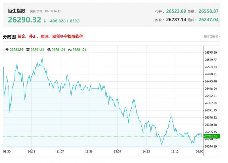 港股收盘行情: 香港恒生指数10月10日(周五)收盘下跌462.27点,跌幅1.73%,报26290.32点; 香港恒生科技指数10月10日(周五)收盘下跌211.59点,跌幅3.27%,报6259.75点; 国企指数10月10日(周五)收盘下跌171.81点,跌幅1.8%,报9358.32点; 红