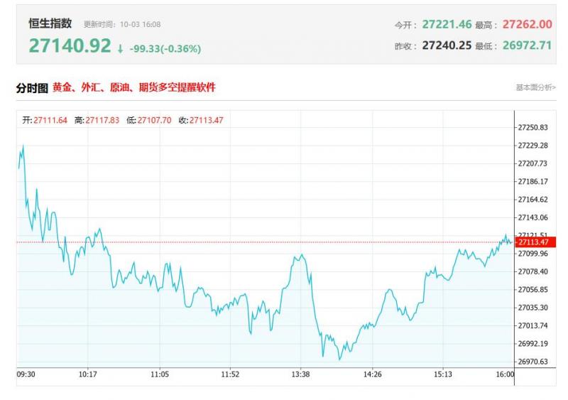 港股收盘行情: 香港恒生指数10月3日(周五)收盘下跌146.2点,跌幅0.54%,报27140.92点; 香港恒生科技指数10月3日(周五)收盘下跌60.01点,跌幅0.9%,报6622.85点; 国企指数10月3日(周五)收盘下跌66.04点,跌幅0.68%,报9658.34点; 红筹指数10月3日(周