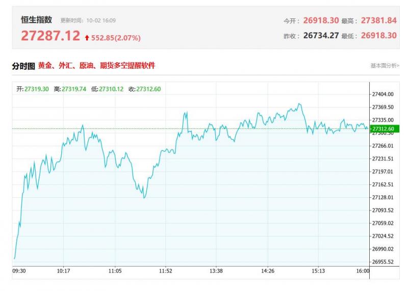 港股收盘行情: 香港恒生指数10月2日(周四)收盘上涨431.56点,涨幅1.61%,报27287.12点; 香港恒生科技指数10月2日(周四)收盘上涨217.2点,涨幅3.36%,报6682.86点; 国企指数10月2日(周四)收盘上涨169.05点,涨幅1.77%,报9724.38点; 红筹指数10月2日(