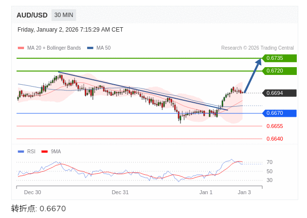 周五盘中,澳元/美元报0.6694,涨幅0.42%. 今日分析:在0.6670之上,看涨,目标价位为0.6720,然后为0.6735。 备选策略:在0.6670下,看空,目标价位定在0.6655,然后为0.6640。 技术点评:RI技术指标缺乏下降动能 支撑位:0.67500.67350.6720