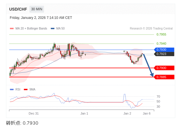 周五盘中,美元/瑞郎报0.7923,涨幅0.13%. 今日分析:在0.7930之下,看跌,目标价位为0.7900,然后为0.7885。 备选策略:在0.7930上,看涨,目标价位定在0.7940,然后为0.7955。 技术点评:上升的空间可能被0.7930阻力位所限制。 支撑位:0.7955