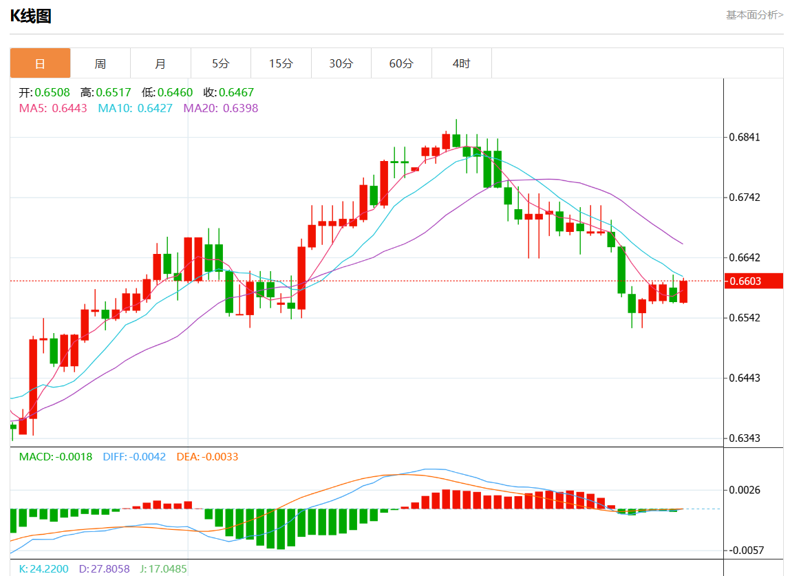 周二盘中,澳元/美元报0.6604,涨幅0.53%。 今日分析:在0.6565上方做多头,目标在0.6615和0.6630。 技术点评:RI显示出上行动能。 支撑位:0.66450.66300.6615 阻力位:0.65650.65450.6525 (亚汇网编辑:静香)