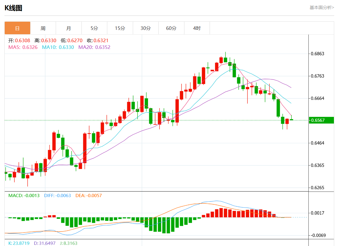 周五盘中,澳元/美元报0.6567,跌幅0.08%。 今日分析:在0.6560上方做多头,目标在0.6595和0.6615。 技术点评:RI涨跌互现。 支撑位:0.66300.66150.6595 阻力位:0.65600.65450.6525 (亚汇网编辑:静香)