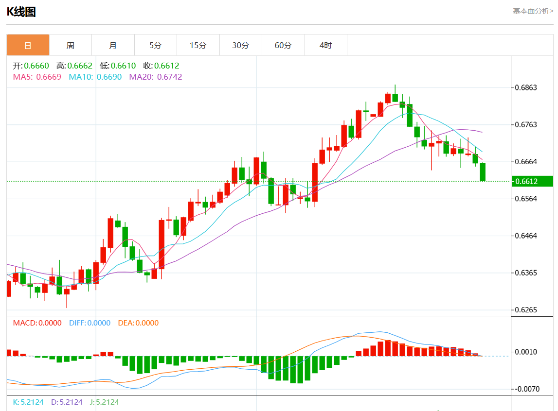 周二盘中,澳元/美元报0.6613,跌幅0.71%。 今日分析:在0.6645之下,看跌,目标价位为0.6600,然后为0.6575。 技术点评:RI技术指标运行趋势复杂,倾向于下跌。 支撑位:0.66800.66600.6645 阻力位:0.66000.65750.6550 (亚汇网编辑:静香)