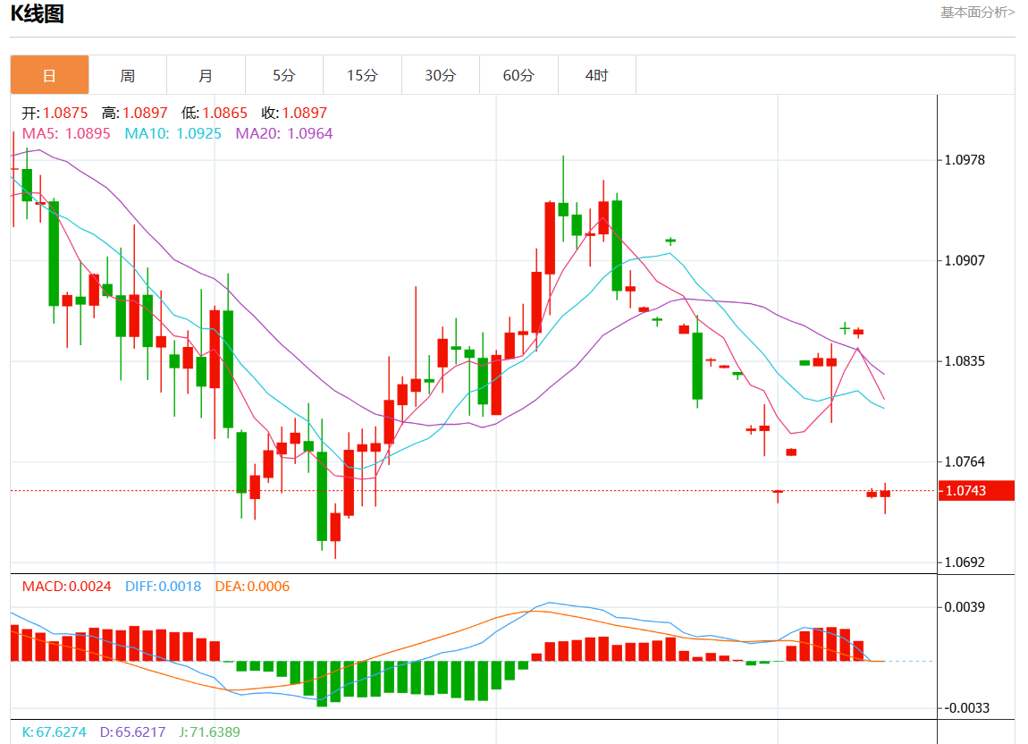 周四欧市盘中,欧元/美元最新报1.0741,日图跌0.01%. 今日分析:在1.0790之下,看跌,目标价位为1.0710,然后为1.0680。 技术点评:只要1.0790阻力位不被突破,向下跌破1.0710位置的风险很高。 支撑位:1.08451.08201.0790 阻力位:1.07101.06801.0650