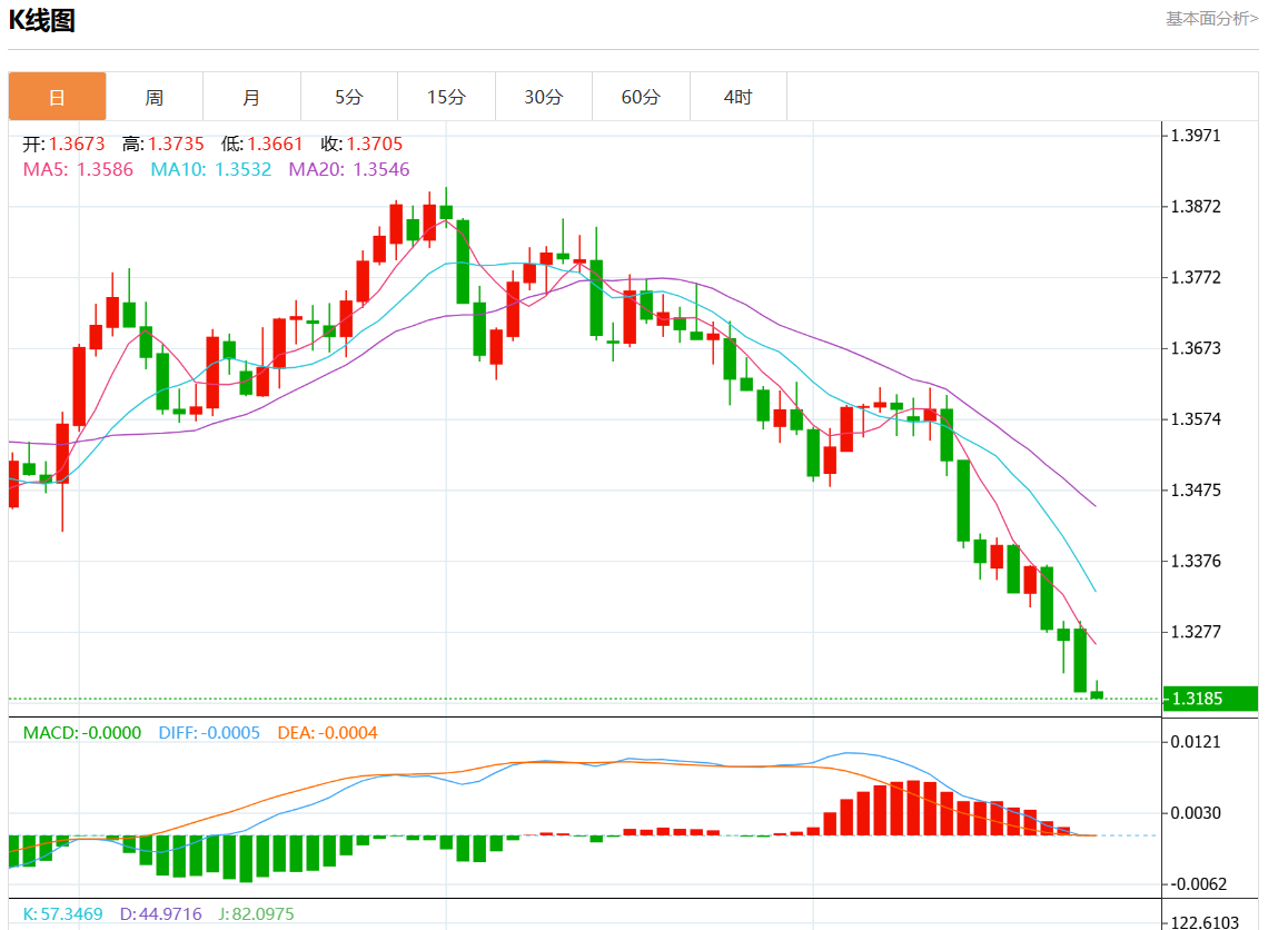 周三盘中,美元/加元报1.3188,跌幅0.05%。 今日分析:在1.3230下方做空,目标在1.3175和1.3150。 技术点评:RI显示出下行动能。 支撑位:1.32851.32601.3230 阻力位:1.31751.31501.3120 (亚汇网编辑:静香)
