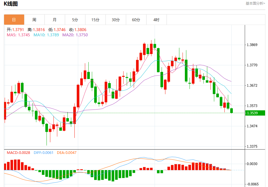 周五盘中,美元/加元报1.3540,跌幅0.15%。 今日分析:在1.3565之下,看跌,目标价位为1.3520,然后为1.3500。 技术点评:跌破1.3565,为空头信号,向下的目标将会是1.3520。 支撑位:1.36051.35851.3565 阻力位:1.35201.35001.3480 (亚汇网编辑