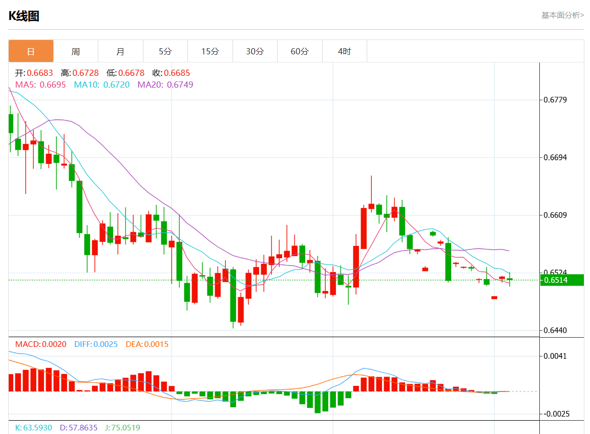周三盘中,澳元/美元报0.6515,跌幅0.05%。 今日分析:在0.6440之上,看涨,目标价位为0.6690,然后为0.6780。 技术点评:RI技术指标缺乏下降动能 支撑位:0.68700.67800.6690 阻力位:0.64400.63350.6265 (亚汇网编辑:静香)
