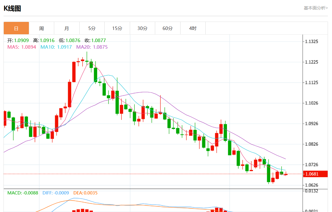 周三欧市盘中,欧元/美元最新报1.0688,日图涨0.08%. 今日分析:在1.0700下方做空头寸,目标在1.0670和1.0655延伸。 技术点评:RI显示出下行势头。 支撑位:1.07301.07151.0700 阻力位:1.06701.06551.0640 (亚汇网编辑:静香)