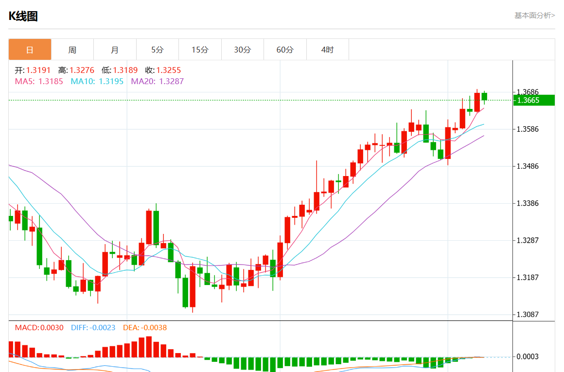 周五盘中,美元/加元报1.3665,跌幅0.14%。 今日分析:在1.3690下方做空,目标在1.3640和1.3625延伸。 技术点评:RI显示出下行势头。 支撑位:1.37251.37051.3690 阻力位:1.36401.36251.3605