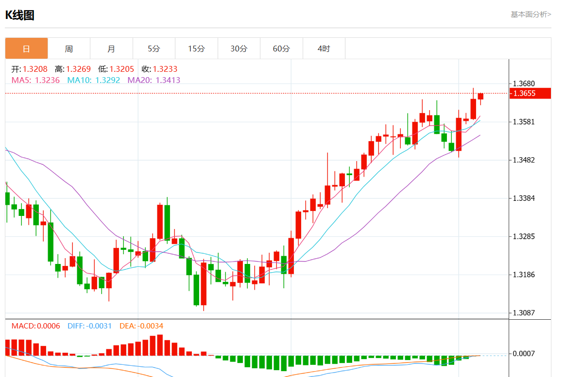 周三盘中,美元/加元报1.3652,涨幅0.08%。 今日分析:在1.3625上方建立多头头寸,目标在1.3670和1.3690。 技术点评:RI显示出上行势头。 支撑位:1.37101.36901.3670 阻力位:1.36251.36051.3585