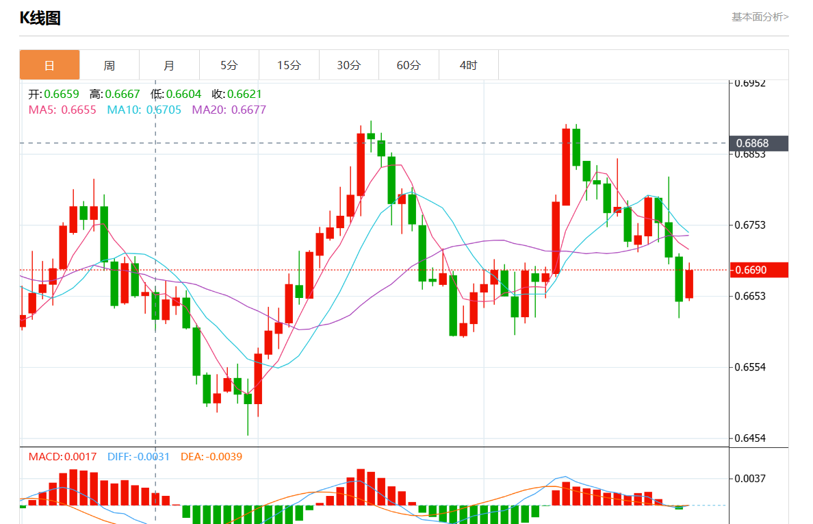 周一盘中,澳元/美元报0.6688,涨幅0.62%。 今日分析:在0.6645上方建立多头头寸,目标在0.6710和0.6740。 技术点评:RI显示出上行势头。 支撑位:0.67700.67400.6710 阻力位:0.66450.66200.6600