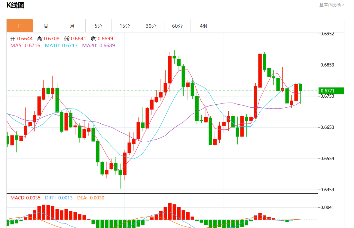 周三盘中,澳元/美元报0.6768,跌幅0.34%。 今日分析:在0.6590之上,看涨,目标价位为0.6900,然后为0.7000。 技术点评:RI技术指标运行趋势复杂,倾向于上涨。 支撑位:0.71400.70000.6900 阻力位:0.65900.64550.6360