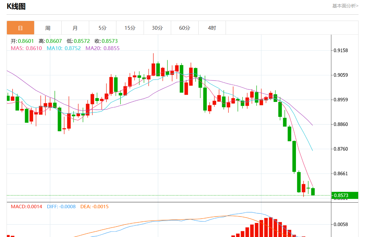 周二盘中,美元/瑞郎最新报0.8572,日图跌0.35% 今日分析:在0.8600下方做空头寸,目标在0.8565和0.8550延伸。 技术点评:RI显示出下行势头。 支撑位:0.86300.86150.8600 阻力位:0.85650.85500.8535